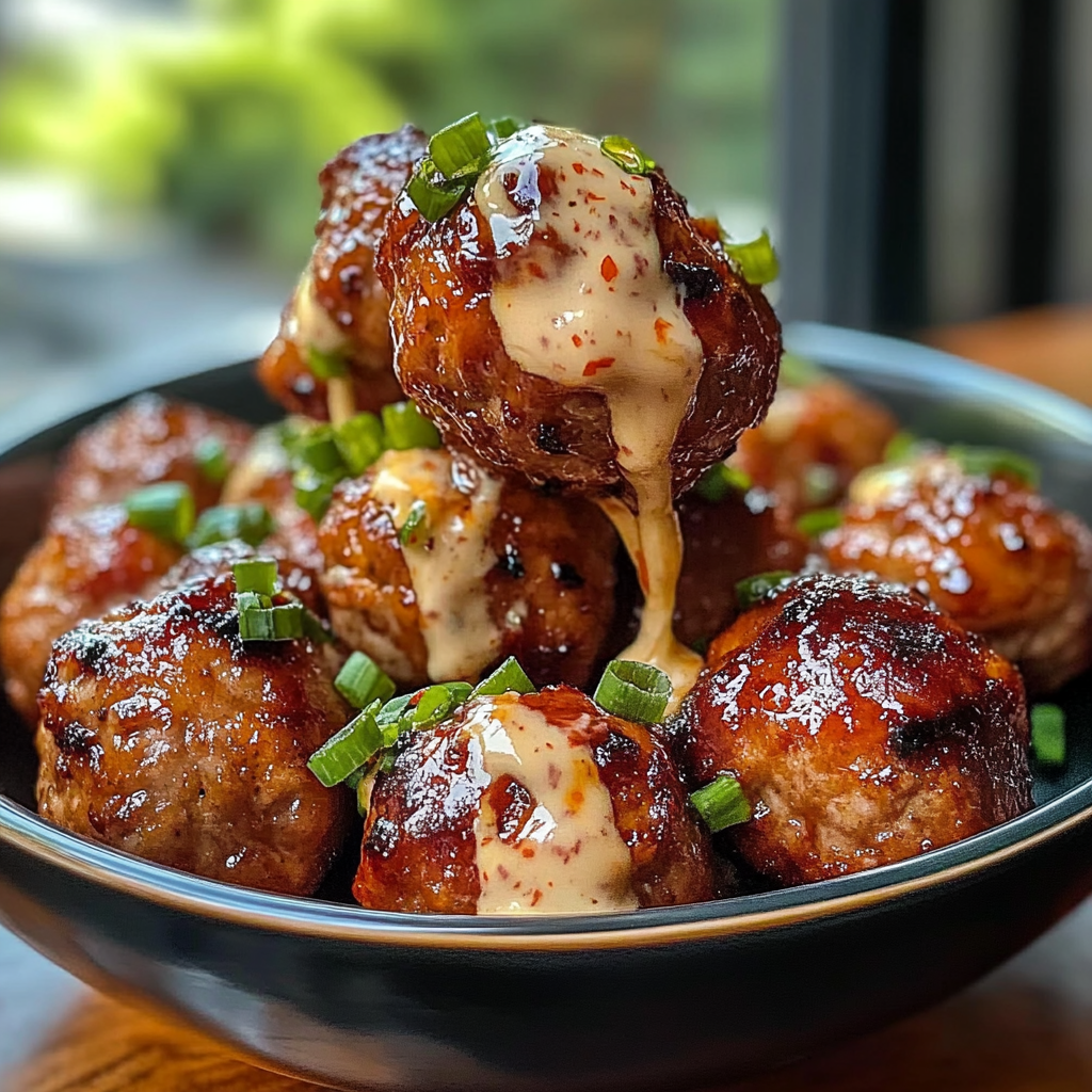 Once the meatballs are ready, let them cool slightly before serving. Drizzle with spicy mayo and sprinkle with sesame seeds or chopped cilantro for added flavor and presentation.