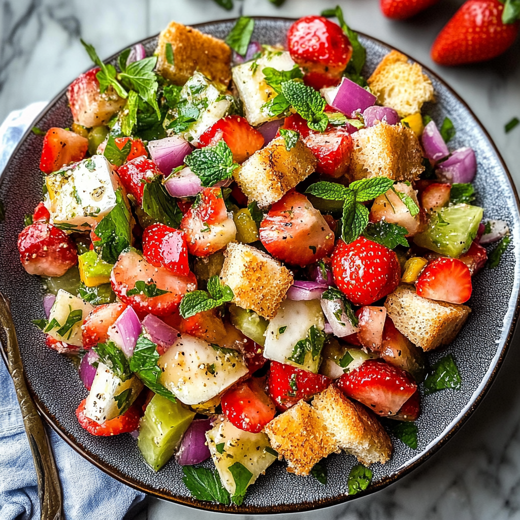 This recipe holds a special place in my heart as it reminds me of sun-drenched afternoons spent at family barbecues where laughter mingled with the aroma of grilled meats. My aunt would whip up this colorful salad, and I couldn’t resist going back for seconds (or thirds!). The combination of fresh basil, juicy strawberries, and crusty bread creates an irresistible dish that not only pleases the eye but also tantalizes the taste buds. Get ready to impress your guests or treat yourself to an extraordinary flavor experience with this Zesty Strawberry Panzanella Salad!