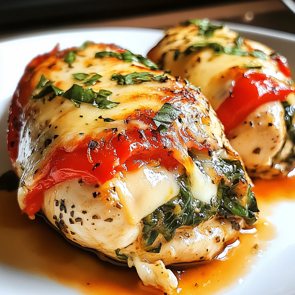 Baked Roasted Red Pepper, Spinach, and Mozzarella Stuffed Chicken is a delightful dish that brings the flavors of Italy to your table. Juicy chicken breasts are generously filled with sweet roasted red peppers, fresh spinach, and creamy mozzarella cheese, creating a mouthwatering meal that’s perfect for family dinners or special occasions. With vibrant colors and rich textures, this dish not only satisfies the palate but also impresses as an elegant centerpiece.