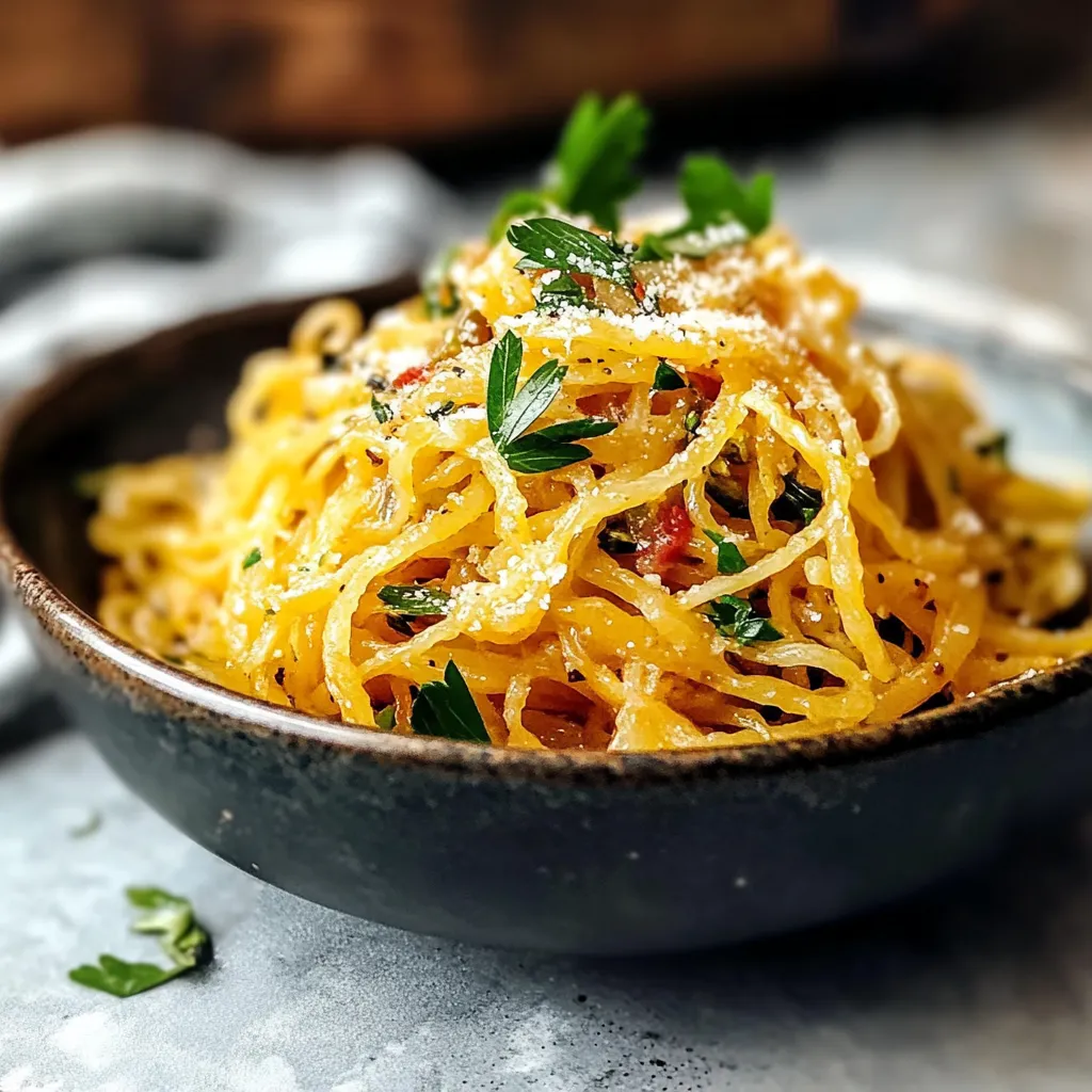Healthy Noodle Recipe / Light Meal Options / LowCarb Pasta Alternative / Luscious Spicy Spaghetti Squash / Nutritious Dinner Ideas / Spicy Spaghetti Squash / Vibrant Vegetable Recipes