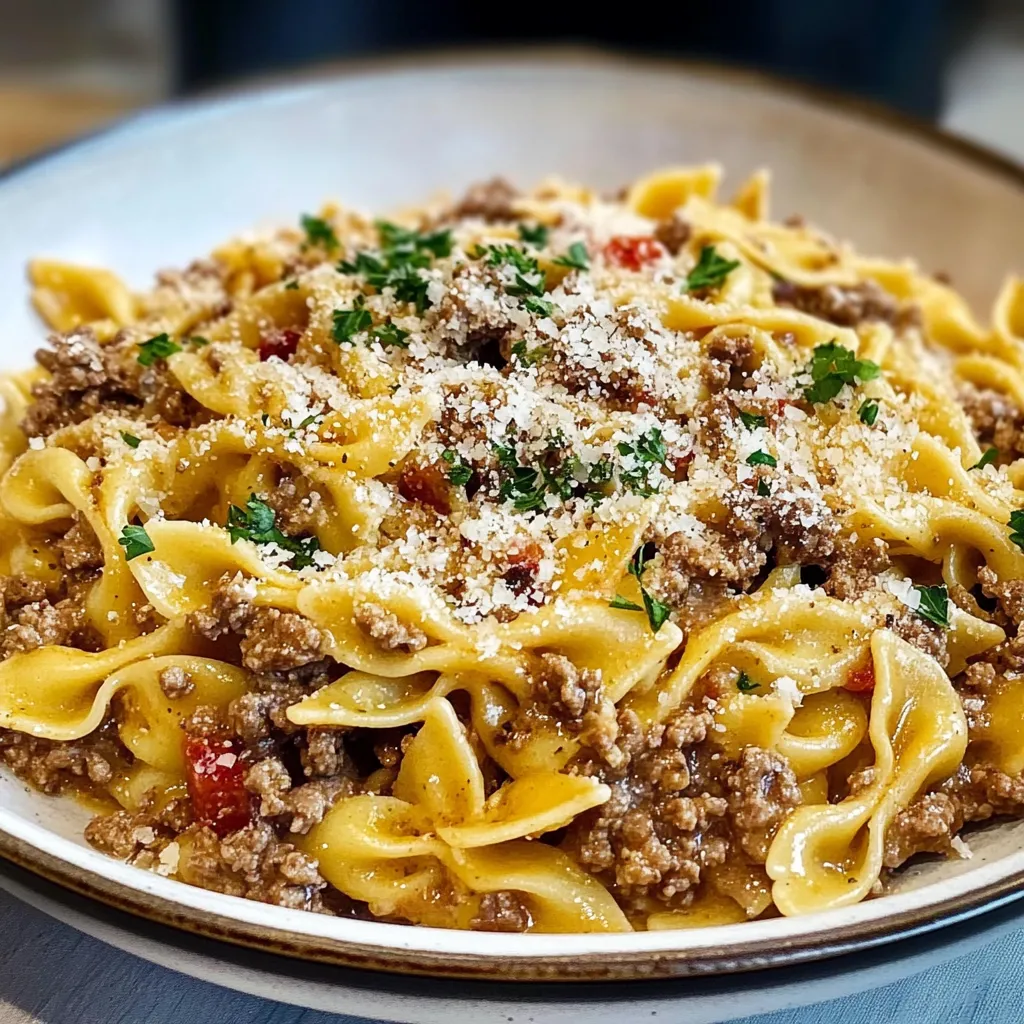 Bowtie Pasta Recipe / Comfort Food Recipe / Easy Weeknight Meal / Family Favorite Recipes / Garlic Butter Pasta / Ground Beef Dinner / Quick Dinner Ideas / Savory Pasta Dish