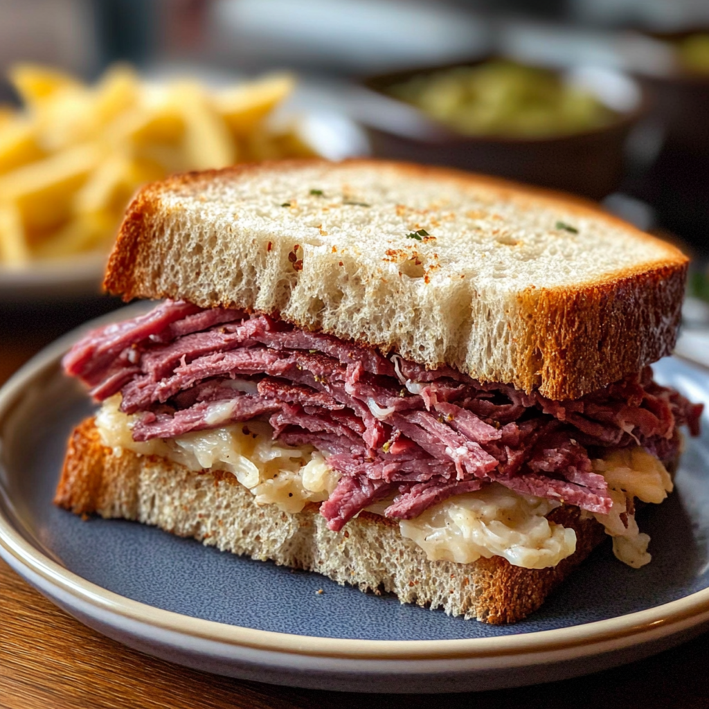 Indulge in the irresistible taste of a homemade corned beef sandwich that takes your taste buds on a savory journey! This classic recipe features tender corned beef layered with zesty sauerkraut and creamy Swiss cheese, all nestled between two slices of hearty rye bread and enhanced with Thousand Island dressing. Perfect for a casual lunch or festive gathering, this sandwich promises to impress your family and friends with its mouthwatering flavors.