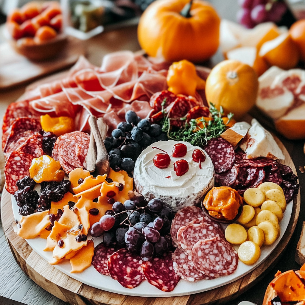 Colorful Fruit Arrangements: Incorporate seasonal fruits like oranges, blackberries, and grapes to enhance the board’s color palette. Arrange them carefully for an eye-catching display that complements the Halloween theme.